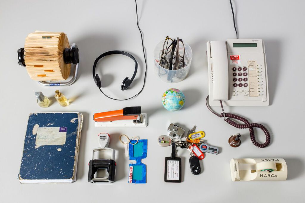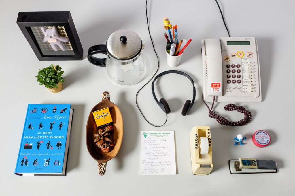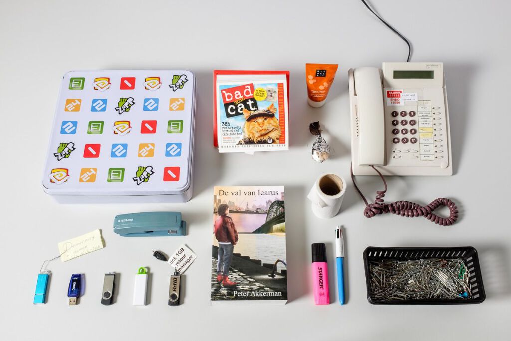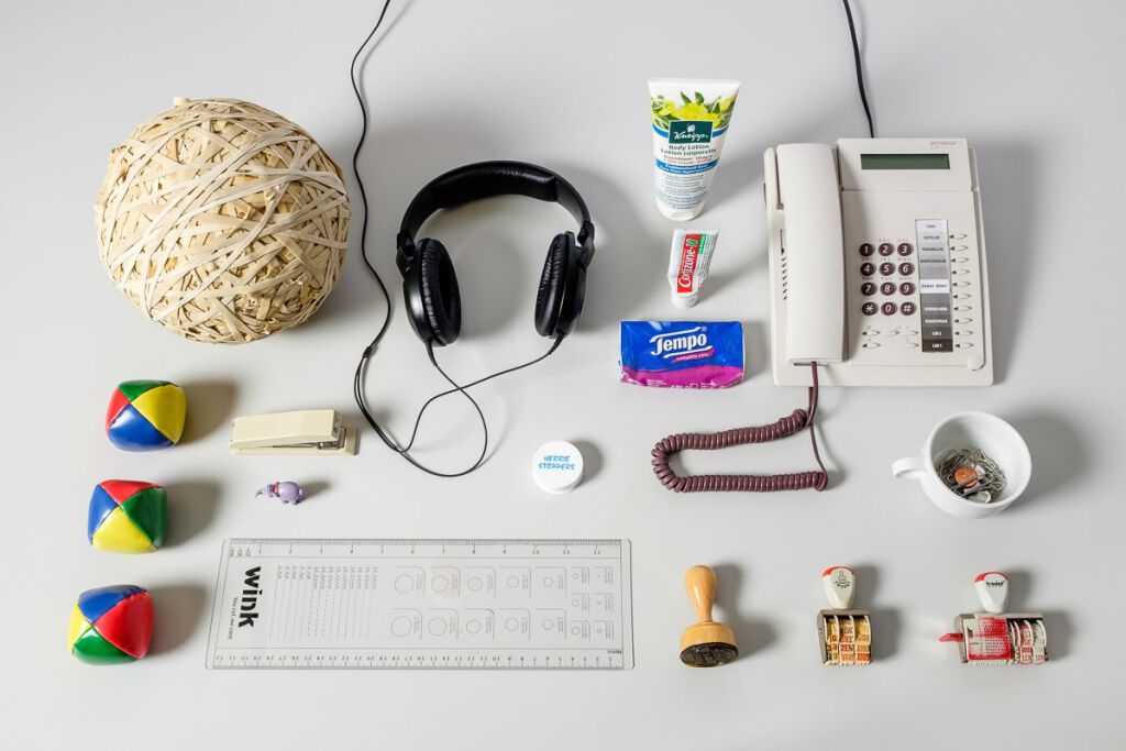 Wat bewaren mensen die op een kantoor werken allemaal in en op hun bureau? Typische kantoorspullen natuurlijk, zoals plakbandhouders en nietmachines (al dan niet voorzien van een naam, of twee namen).